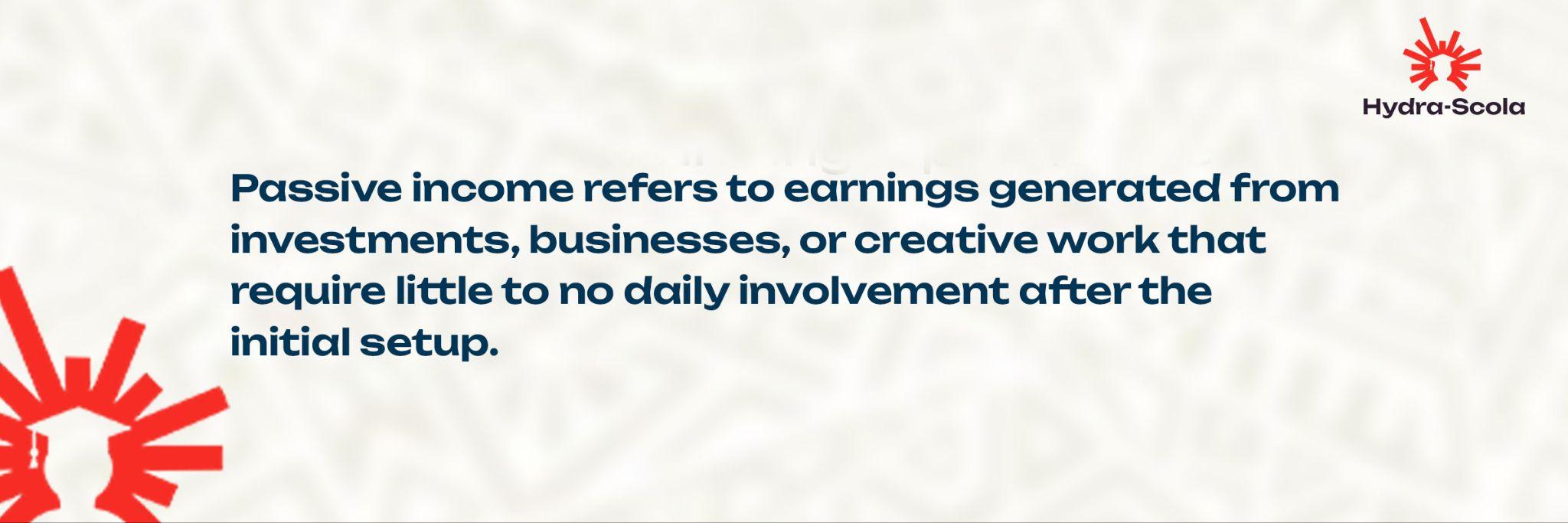 Passive income refers to earnings generated from investments, businesses, or creative work that require little to no daily involvement after the initial setup.
