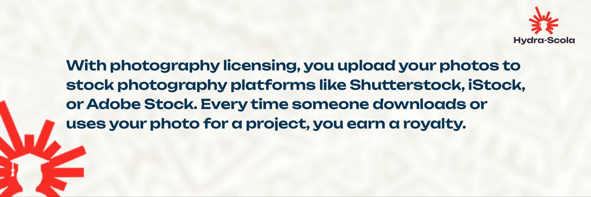 With photography licensing, you upload your photos to stock photography platforms like Shutterstock, iStock, or Adobe Stock. Every time someone downloads or uses your photo for a project, you earn a royalty.