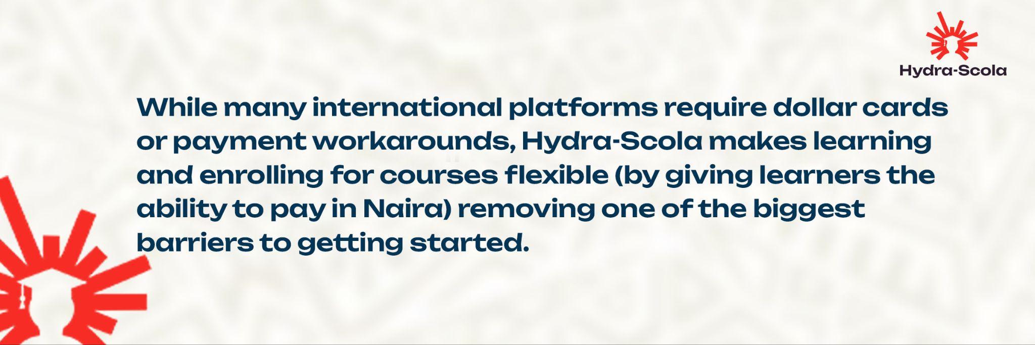 While many international platforms require dollar cards or payment workarounds, Hydra-Scola makes learning and enrolling for courses flexible (by giving learners the ability to pay in Naira) removing one of the biggest barriers to getting started.